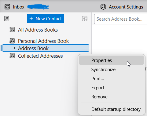 Right-click within this side window space to bring up the following and select New Address Book: