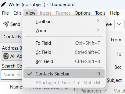 Select View > Contacts Sidebar or press function key F9 to turn on the Contacts Sidebar when writing emails to select the email addresses.